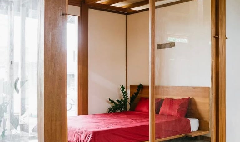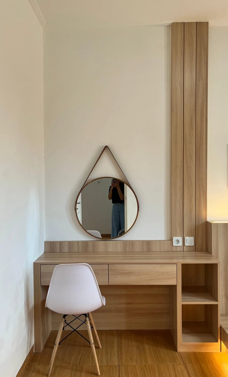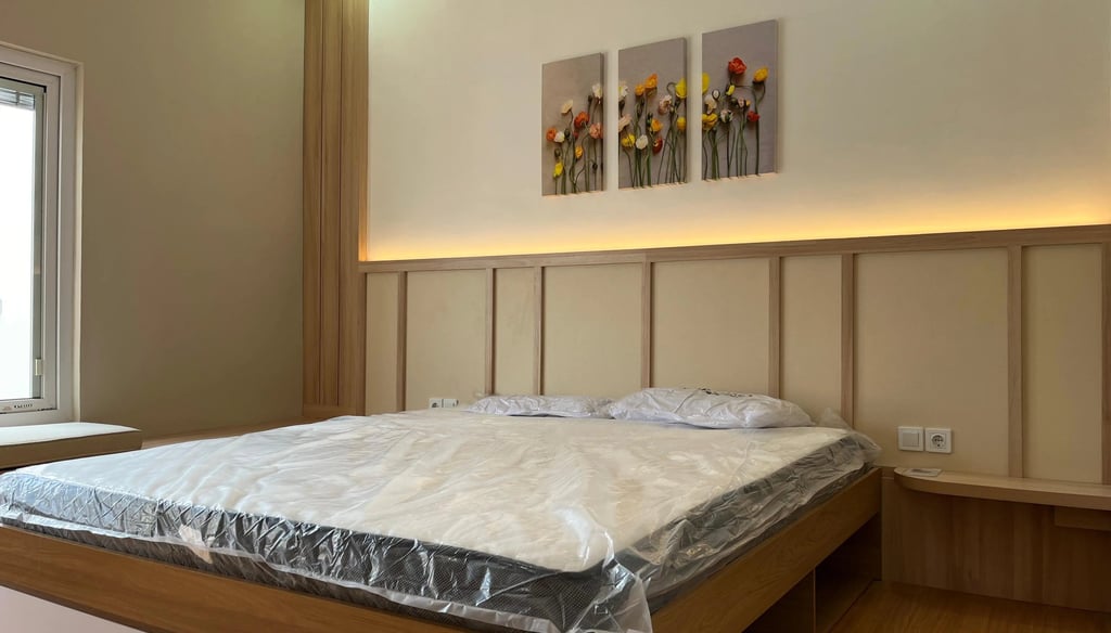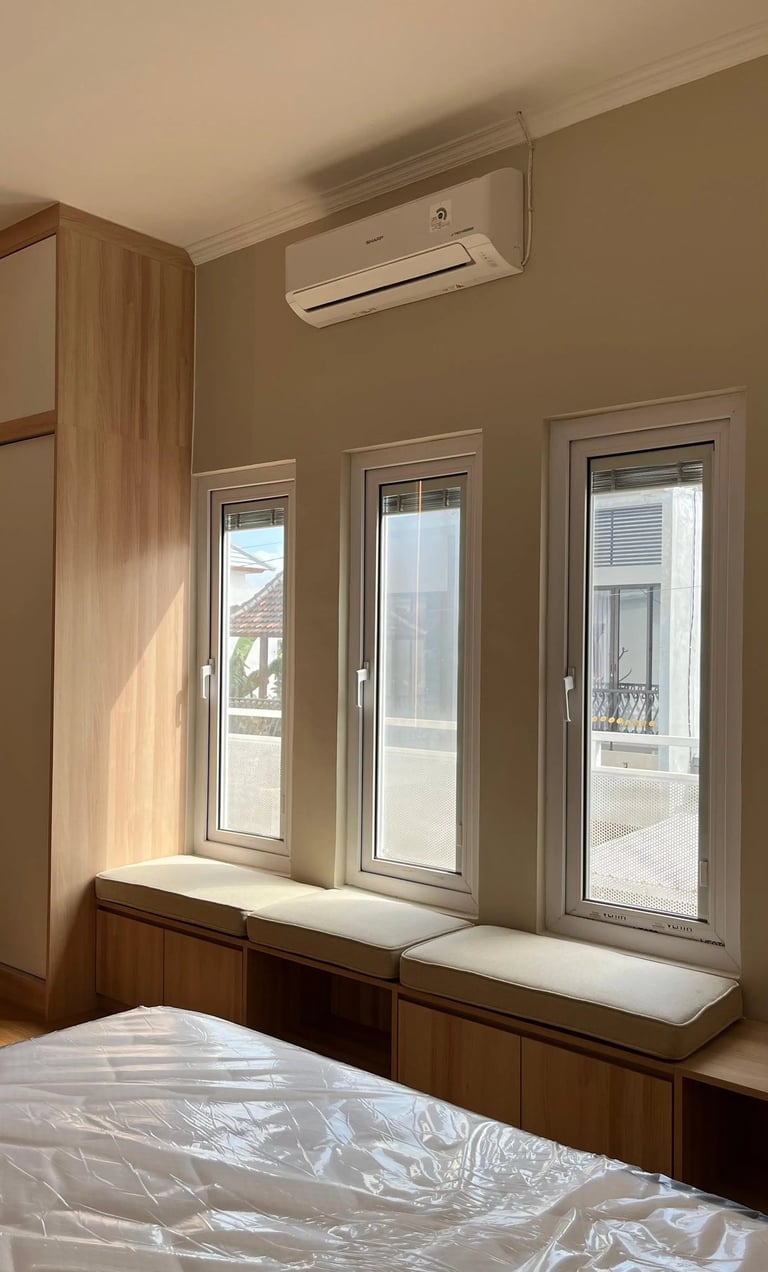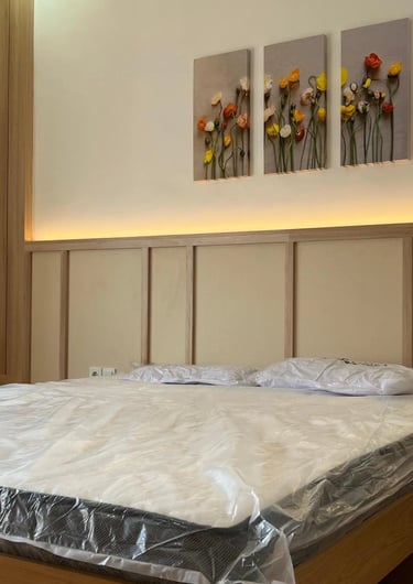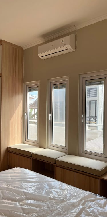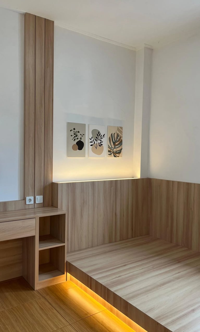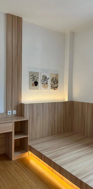 This project involves the interior design of a residential house located in Denpasar, focusing on the master bedroom and guest bedroom. The design adopts a minimalist japandi natural style, utilizing plywood as the primary interior material, finished with white and natural woodgrain HPL to create a minimalist, bright, and warm atmosphere.