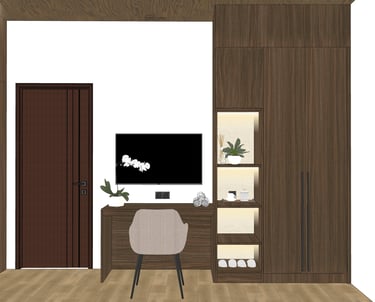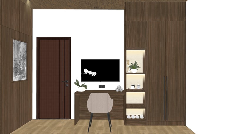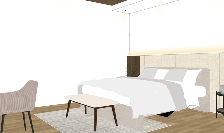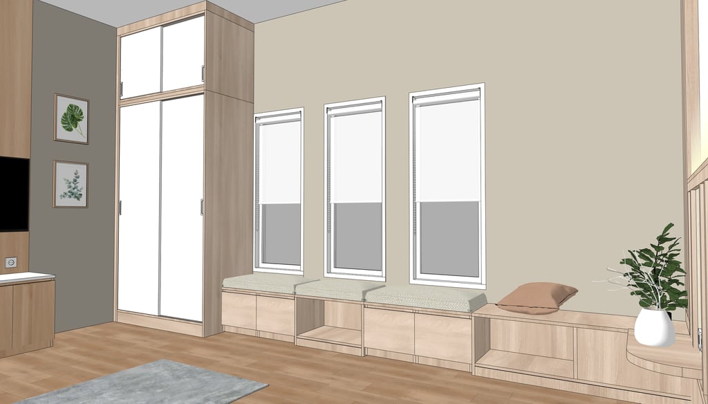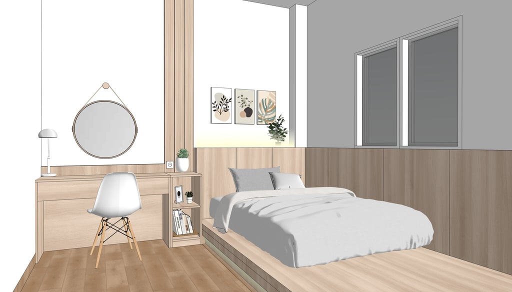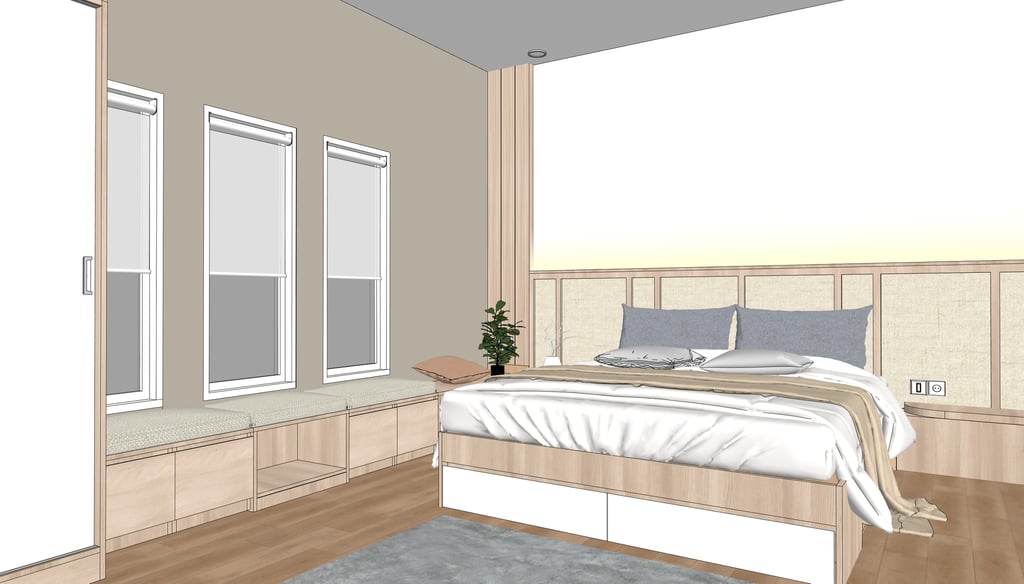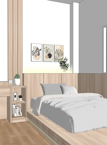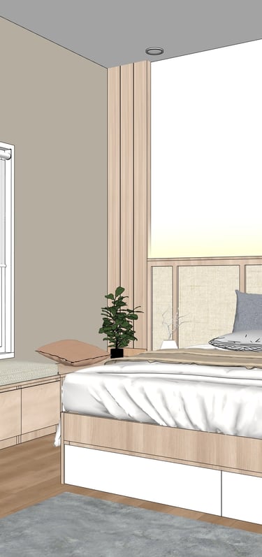 This portfolio project was completed as part of a studio project designing the bedroom interior. The designer handled the design process from client consultation, user needs briefing, and concept development, to design development and design presentation, up to the project agreement and payment stage. The designer was not involved in project supervision or construction monitoring.