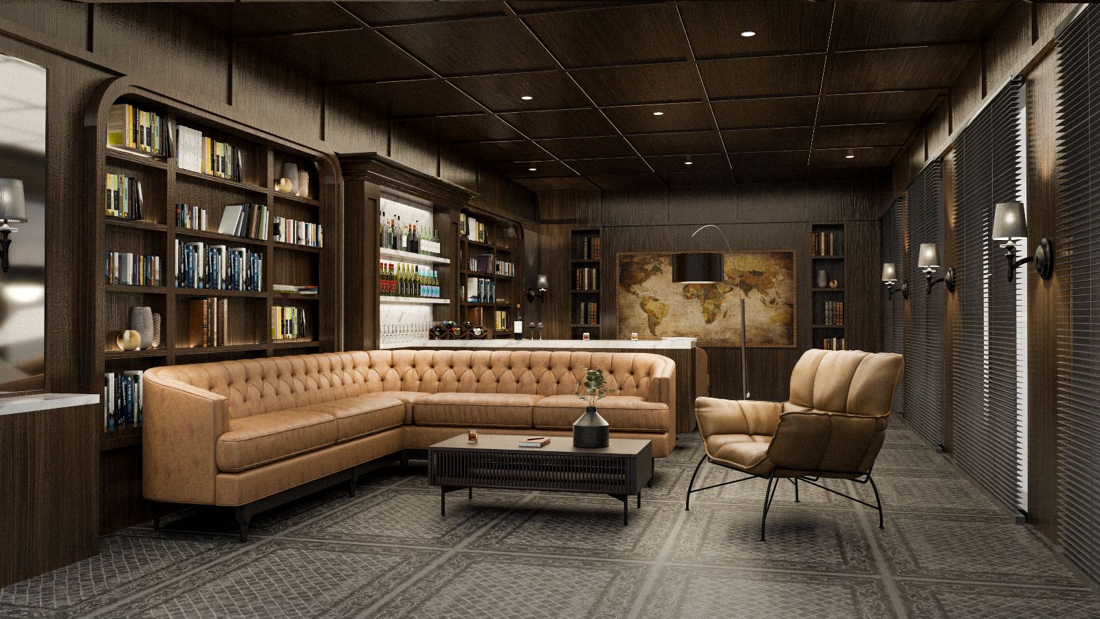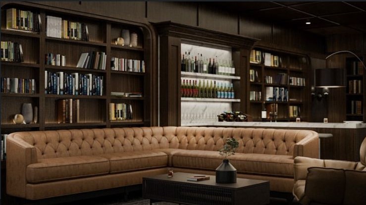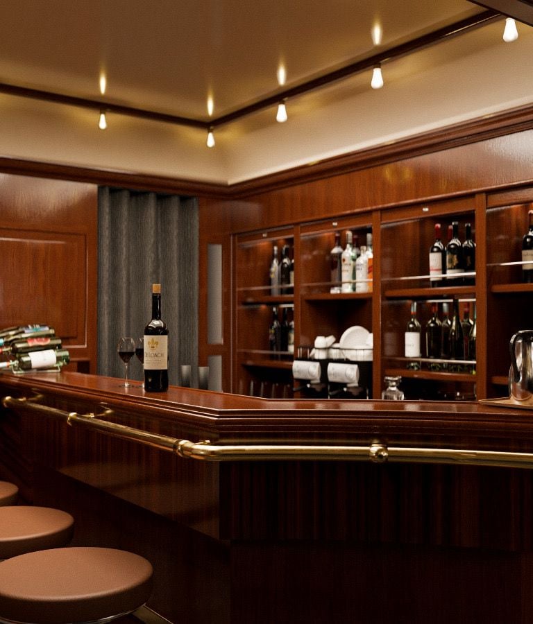 The pub interior design adopts a refined classic style, featuring a combination of warm wooden materials and genuine leather upholstery used for the seating cushions. Subtle gold accents are incorporated to enhance the elegant and sophisticated atmosphere of the space.