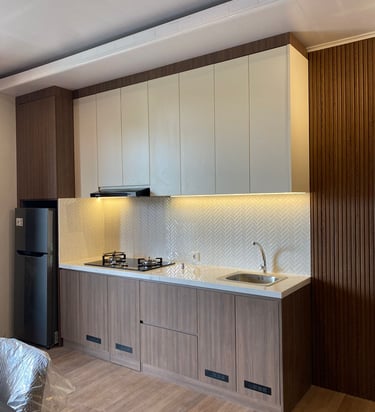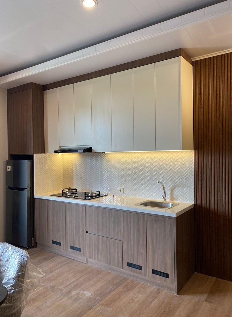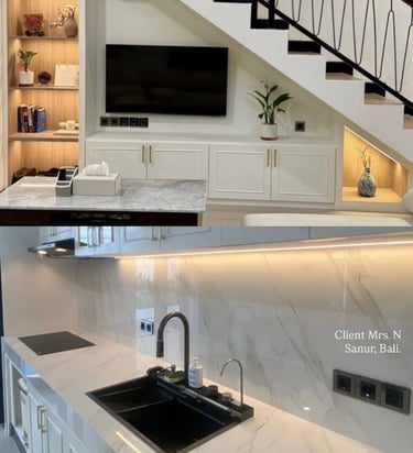 This project involves the interior design of a guest house located in Sanur, developed in a modern contemporary style. The interior primarily uses plywood materials, finished with HPL from Taco Product, creating a clean, modern, and functional atmosphere throughout the space.