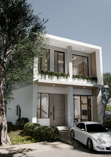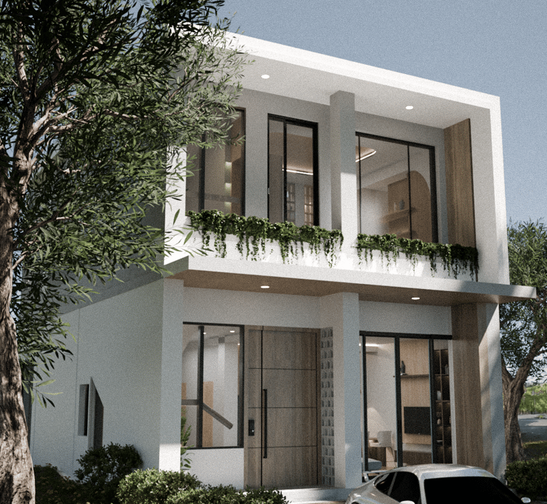 This project involves the architectural and interior design of a residential house, developed in a modern contemporary style. The exterior incorporates conwood material as a facade accent, while the interior utilizes plywood elements to create a clean and warm spatial character.