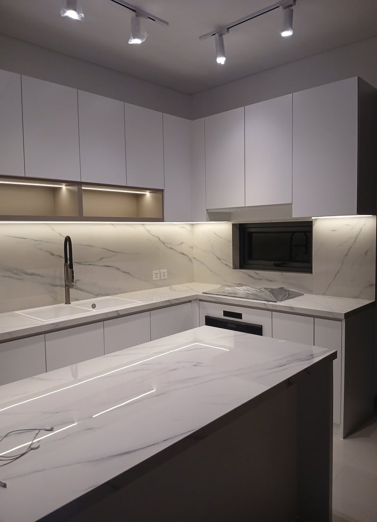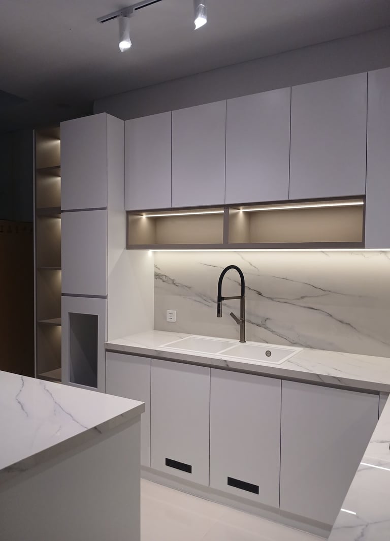 This project involves the interior design of a residential house located in Denpasar, focusing on the kitchen area. The design adopts a minimalist all-white style, utilizing plywood as the primary interior material, finished with white and grey HPL to create a clean, bright, and modern atmosphere.